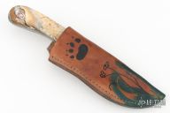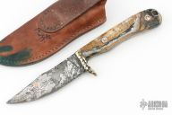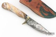 This knife by Miles Martin has a Damascus blade with copper inlay and acid etched flower art, .075" blade stock and 1.093" blade depth, full tang construction. The guard is a lost wax cast made just for this knife from a bronze Yukon river barge propeller. The handle has fossil mammoth tooth scales with custom mosaic pins. Comes with a decorated brown leather sheath. New from maker. Comes with a note from the maker!