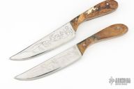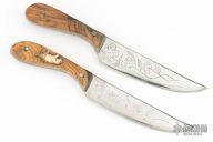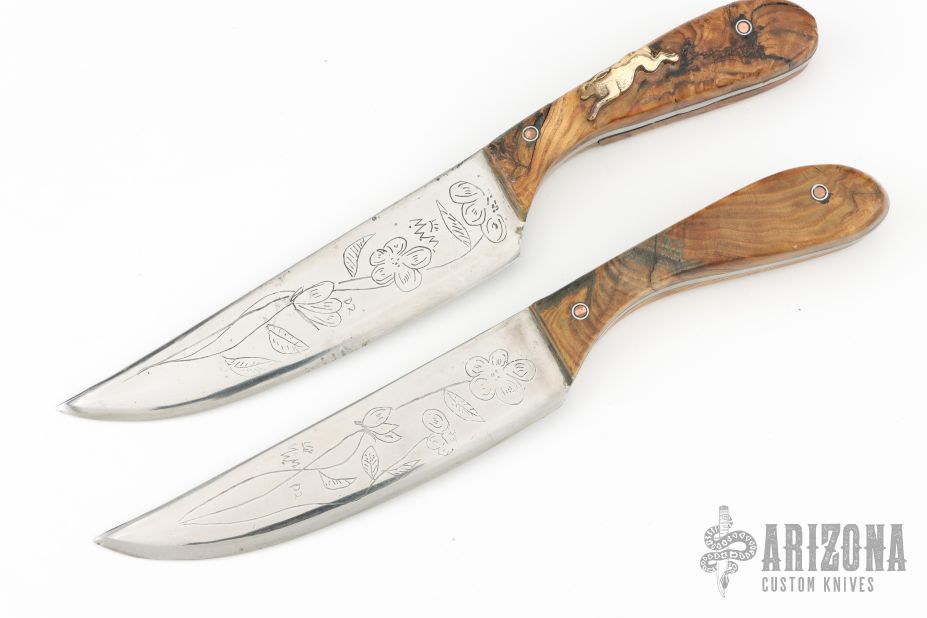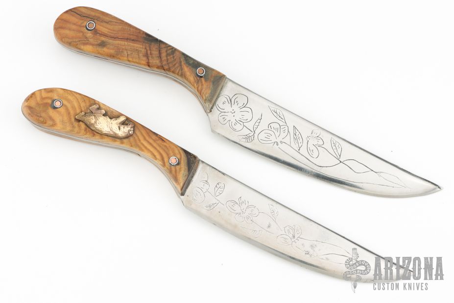 This Steak Knife Set by Miles Martin features satin finished blades with etched flower motif, full tang construction, .115" blade stock and 1" blade depth.  The handle has Alaskan Poplar wood scales with custom mosaic pins and brass inlays, one bear and one rabbit. Comes with COA. New from maker!