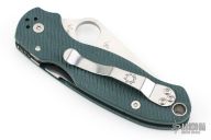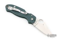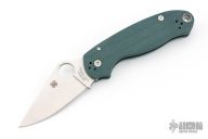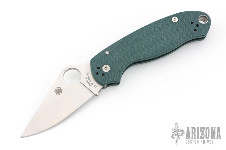 This Paramilitary 3 from Spyderco has a satin finished clip point blade with thumb hole and notched thumb rest. Handle has textured green g10 scales with 4-way reversible clip. Comes with original box and paperwork. Excellent condition.