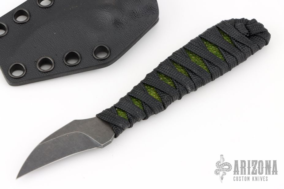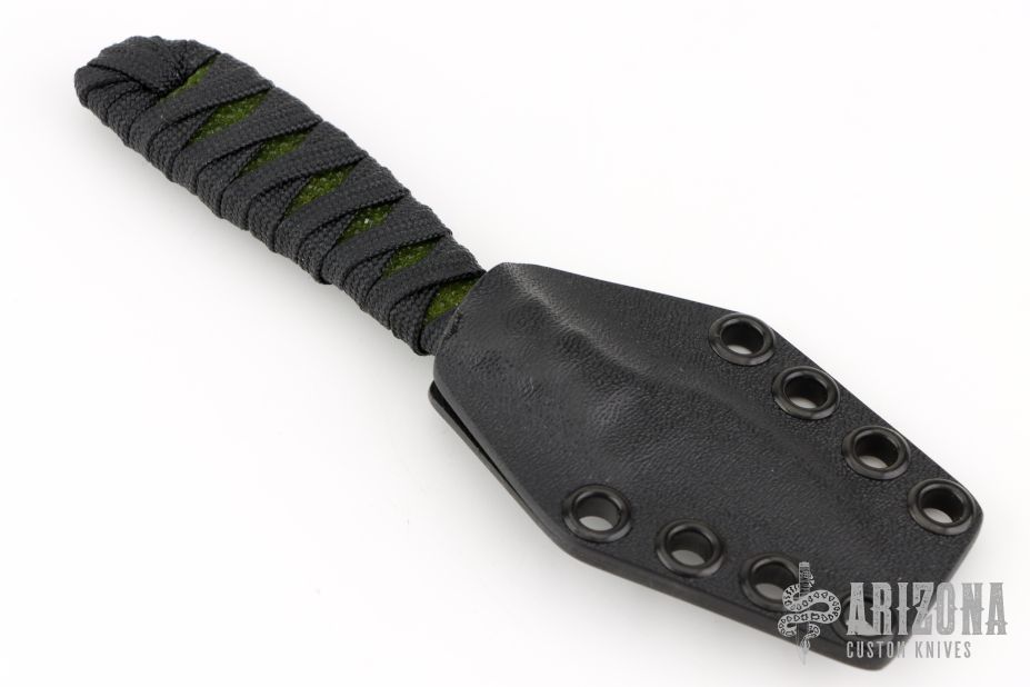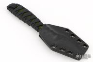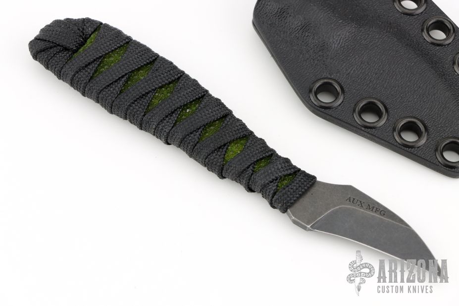 This Tsume by Auxiliary Manufacturing features an acid tumbled blade .110" blade stock and .725" blade depth. The handle has epoxied black cord wrap over Stingray. Comes with a kydex neck sheath. New from maker!