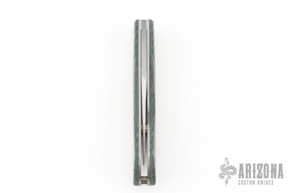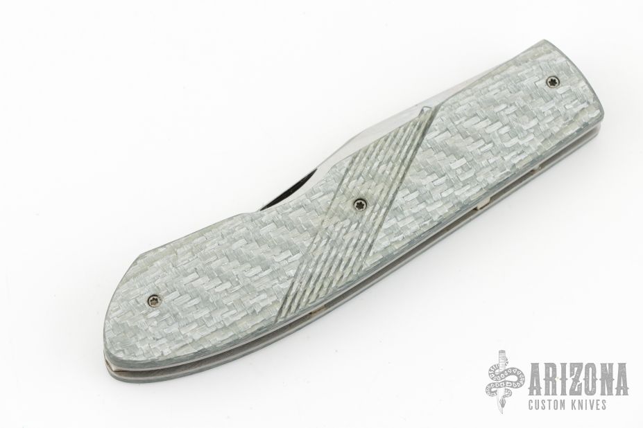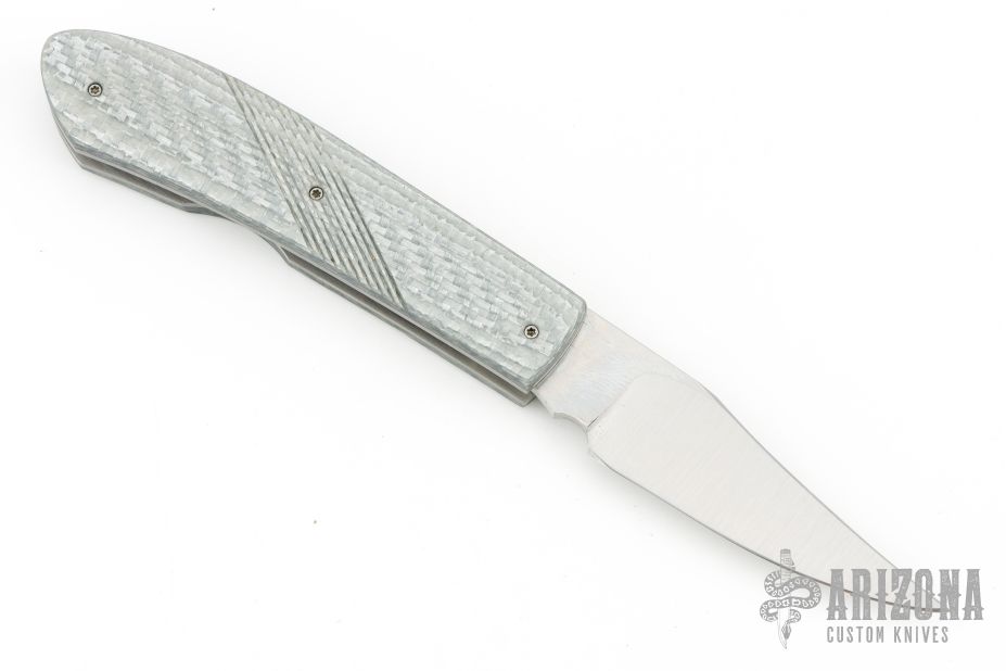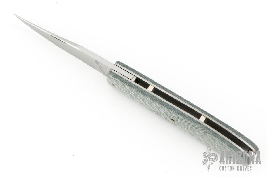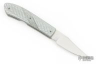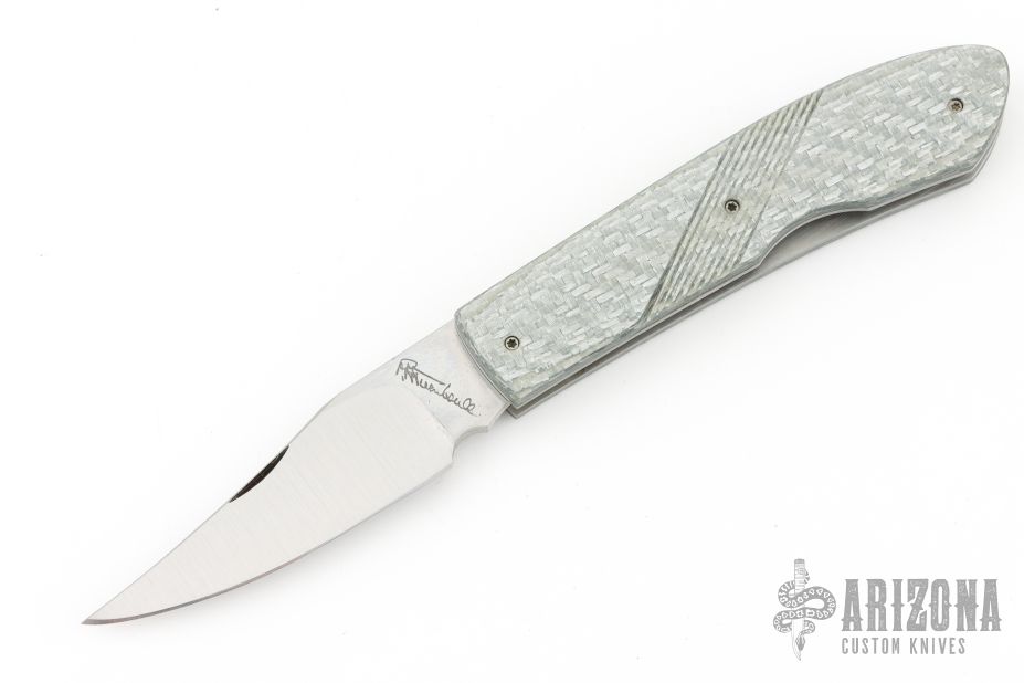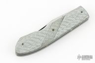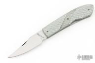 This double ball detent slipjoint by Ralph Turnbull features a satin finished blade with nail nick. The handle has silver twill covers with fluting, titanium liners. Excellent condition.