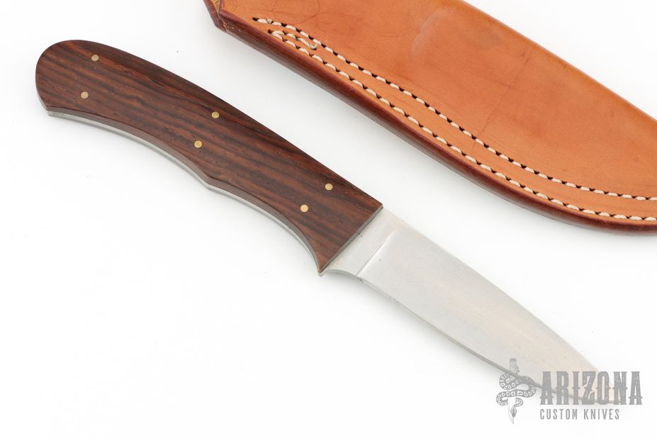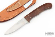 This Working Hunter by Corbet Sigman features a satin finished blade, .121" blade stock and .959" blade depth, full tang construction. The handle has cocobolo scales with brass pins. Excellent condition. Comes with a brown leather sheath.