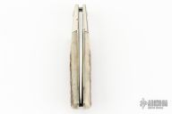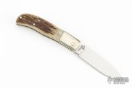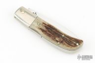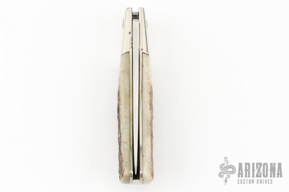 This Mid-Lock folder by WT Fuller features a mirror polished blade with nail nick. The handle has nickel silver dovetailed bolsters, stag scales with nickel silver pins and liners, stainless steel backspacer. Nice lock up and blade seating. Has some light scratches, otherwise excellent condition.