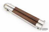This early balisong from Pacific Cutlery features a Jody Samson ground satin finished blade with swedge. The handles are stainless steel with dovetail ironwood inlays, has t-latch. Comes with Bali-Song nylon velcro belt sheath. Has some light scuffs and scratches and a couple light rust spots. Great condition otherwise.