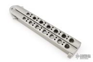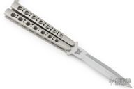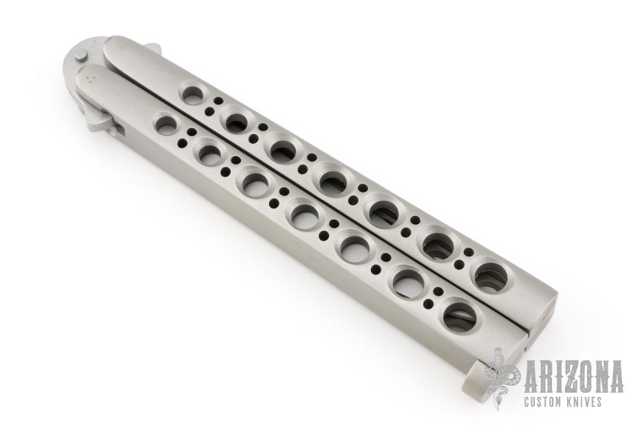 This early Scimitar Balisong features a Jody Samson ground "Military" finished blade. The handles are "Military" finished stainless steel. Comes with Bali-Song nylon Velcro belt sheath. Has some light scuffs and scratches, otherwise good condition.