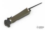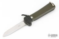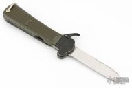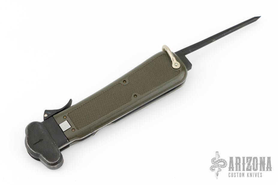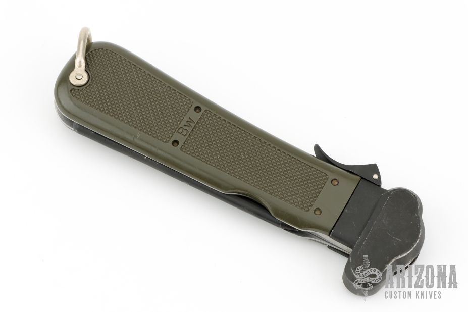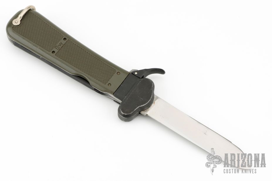 This knife features a satin finished blade. Blade deploys with gravity. The handle is black/green plastic. Has been used and carried, scuffs and scratches, fair condition.