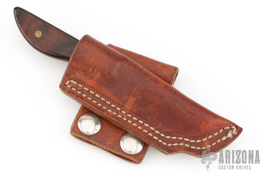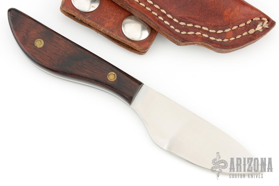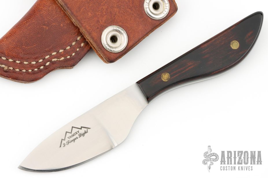 This Small Skinner by TJ Yancey features a satin finished drop point blade, .130" blade stock and .927" blade depth, full tang construction. The handle has dymondwood scales. Comes with a brown leather sheath. Excellent condition.