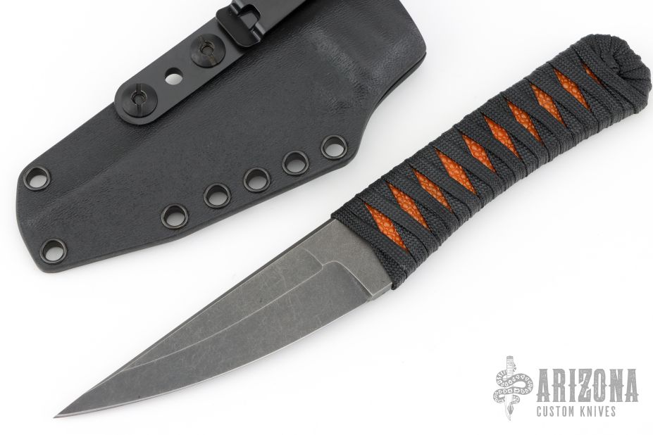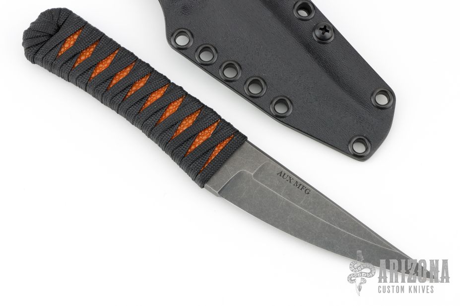 This KTK by Auxiliary Manufacturing features an acid tumbled blade with .195" blade stock and 1.073" blade depth. The handle has a cord-wrapped handle over stingray skin. Comes with a kydex sheath with clip. New from Maker!