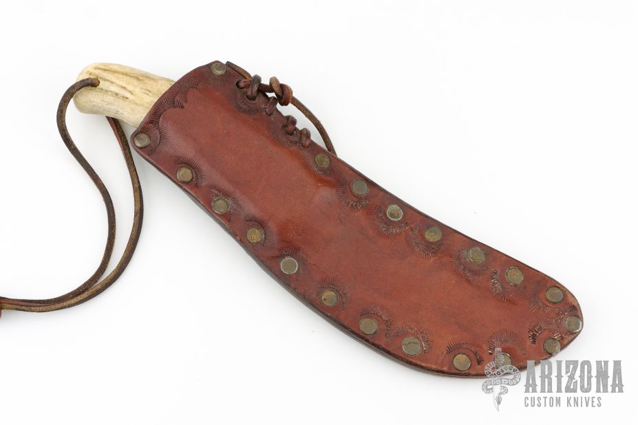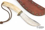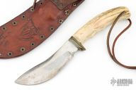 This Skinner by Rudy Ruana features a satin finished blade with a partially sharpened top edge and notched thumbrest, .182" blade stock and 1.467" blade depth, hidden tang construction. The handle has a fluted brass guard with a stag grip with a lanyard hole. Comes with a hand tooled brown leather sheath. Has some scratches and has been resharpened, has some patina, otherwise good condition for its age. "M" Stamp. One of a kind. Made between 1962-1983.