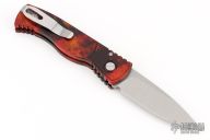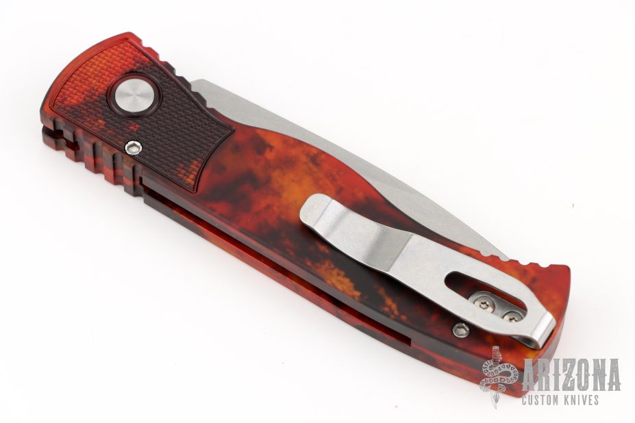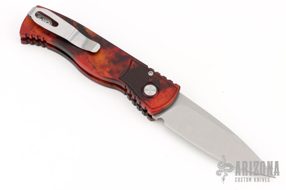 This knife by Pro-Tech Knives features a stonewashed drop point blade. The handle has a "Del Fuego" finished aluminum frame with a tip up steel pocket clip. Includes original box and paperwork. Excellent condition.