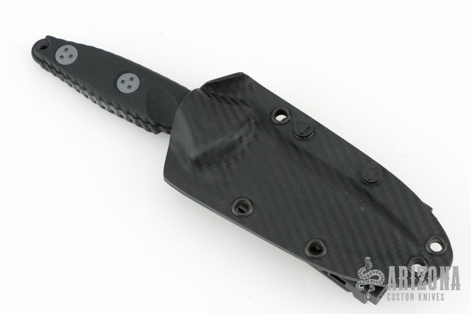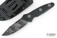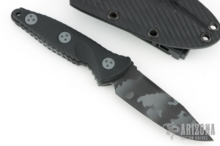This Mini Socom Alpha by Microtech features an urban camo clip point blade with a notched thumb ramp and a full tang construction, .169" Blade Stock. 1.178" Blade Depth. The handle features black G10 scales. Includes a kydex sheath, original box and papers. Excellent Condition. Dated 03/2023 and #5080