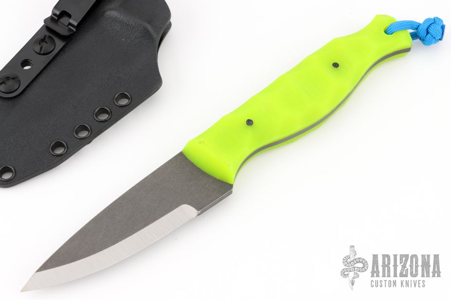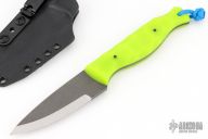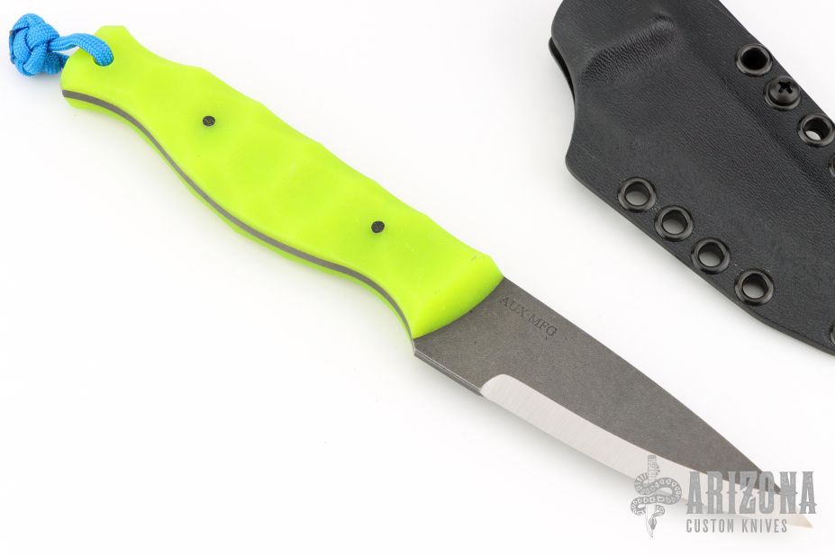 This Bushcrafter by Auxiliary Manufacturing features a dark tumbled blade with scandi grind, .135" blade stock and 1.142" blade depth. The handle has dayglo G10 scales. Comes with a kydex sheath with clip. New from maker!