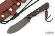 This Pioneer by Smith & Sons features a dark tumble finished blade with .150" blade stock and 1.172" blade depth, full tang construction. The handle has black jigged bone scales with red liners and brass tubes and mosaic pins. Comes with a brown leather sheath, COA dated 5-30-19 and original box. Excellent condition.
