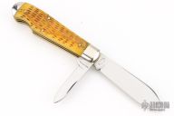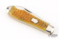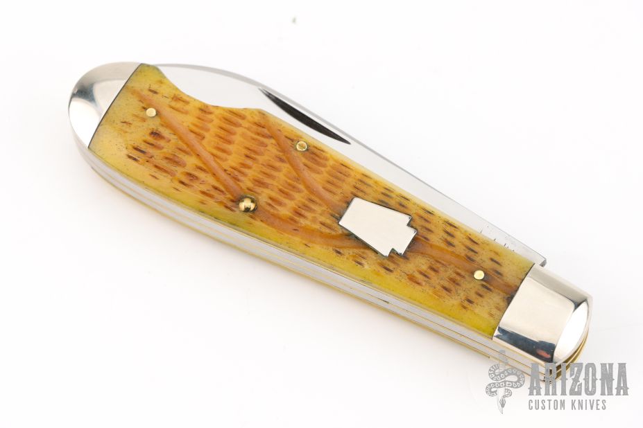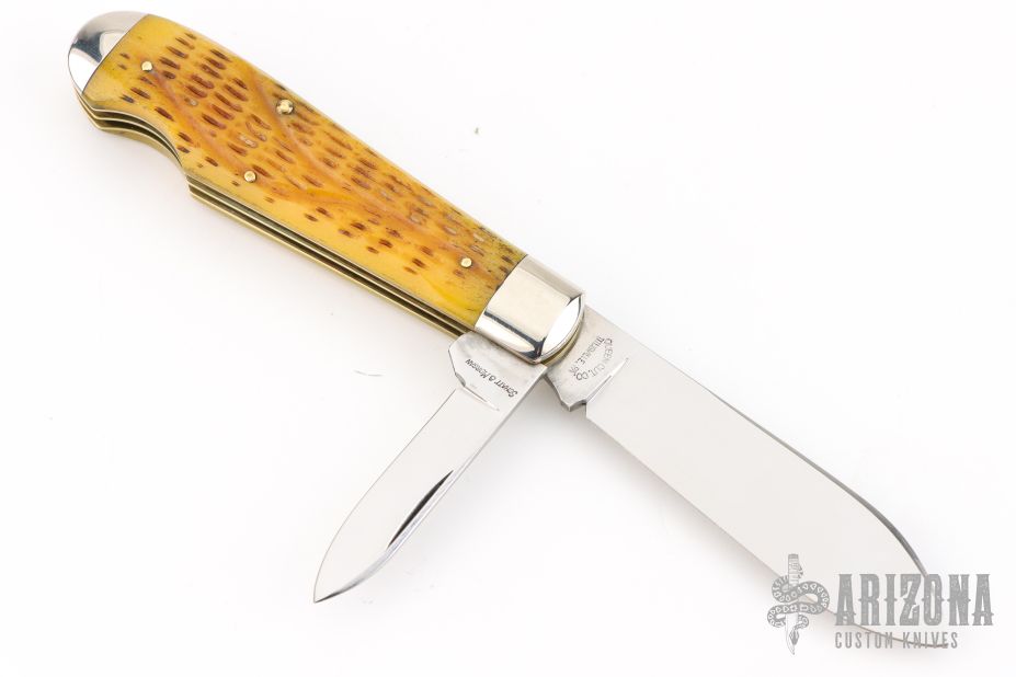 This Easy Open Jack by Schatt & Morgan features two mirror finished blades with nail nicks. The handle has nickel silver bolsters, antique jigged bone covers, brass liners and stainless steel springs. Has half-stops. Comes with original box. Excellent condition.