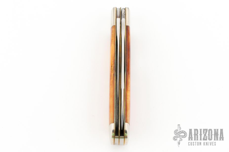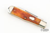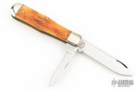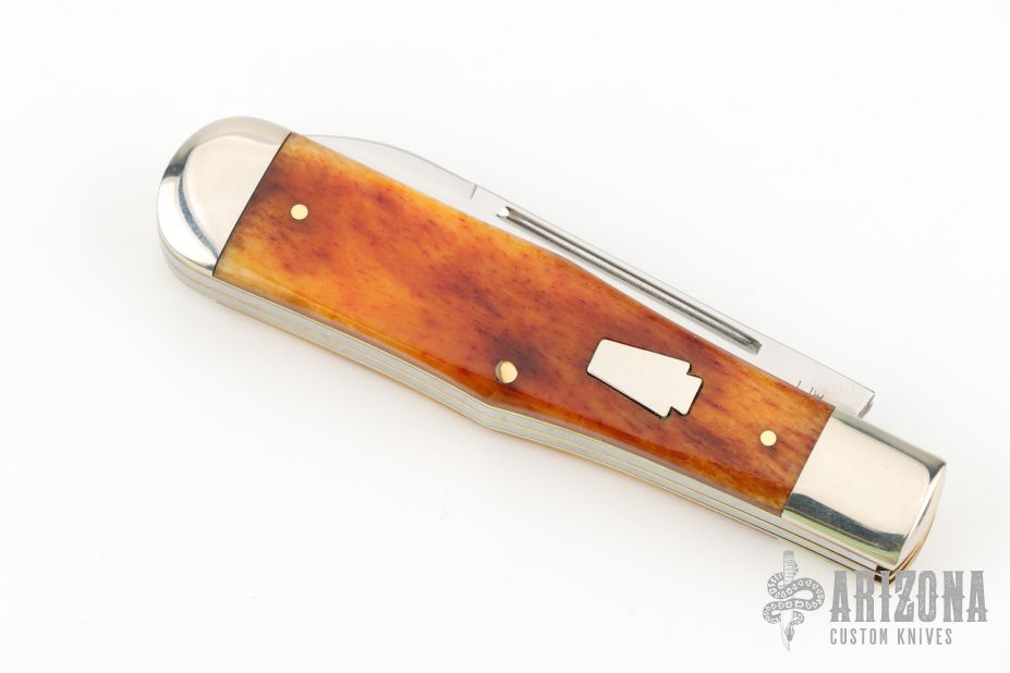 This slipjoint by Schatt & Morgan features two mirror finished blades with nail nicks. The handle has nickel silver bolsters, caramel bone covers, brass liners and stainless steel springs. Comes with original box. Excellent condition. 1 of 600