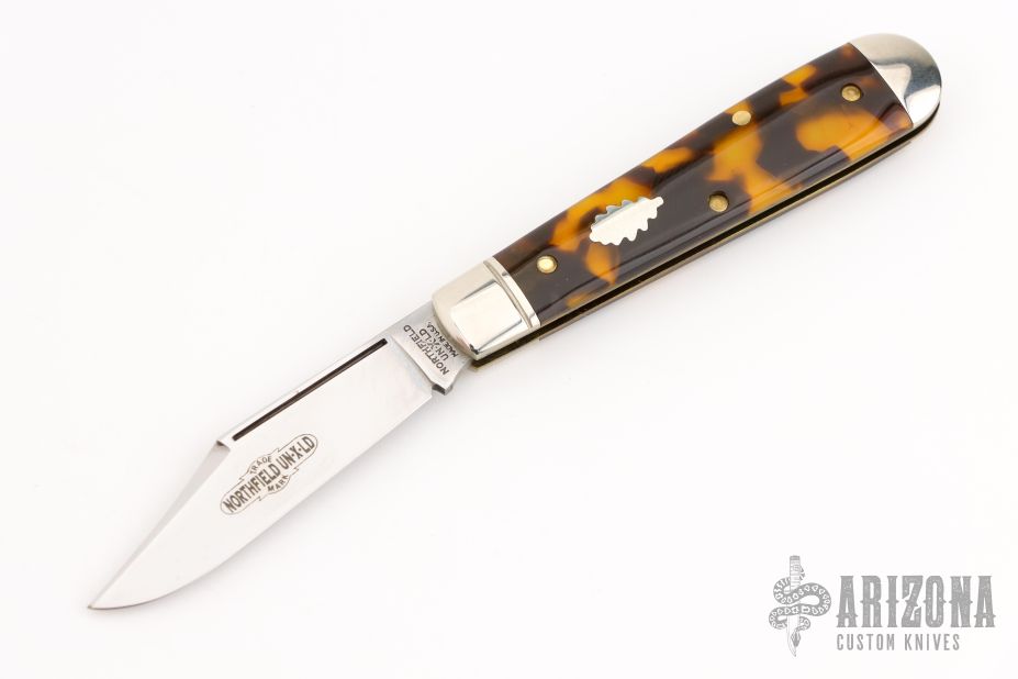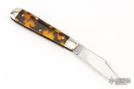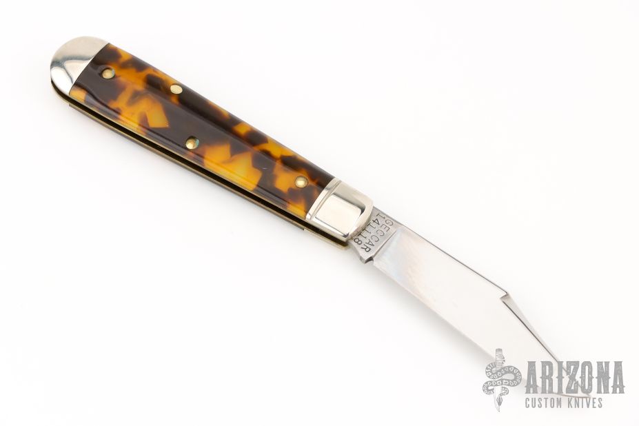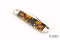 This slipjoint by Great Eastern Cutlery features a satin finished blade with nail nick. The handle has stainless steel bolsters, Tortoise Shell Acrylic covers with stainless steel liners/pins, steel spring. Has half-stop.  Comes with original tube. Excellent condition. 97 made