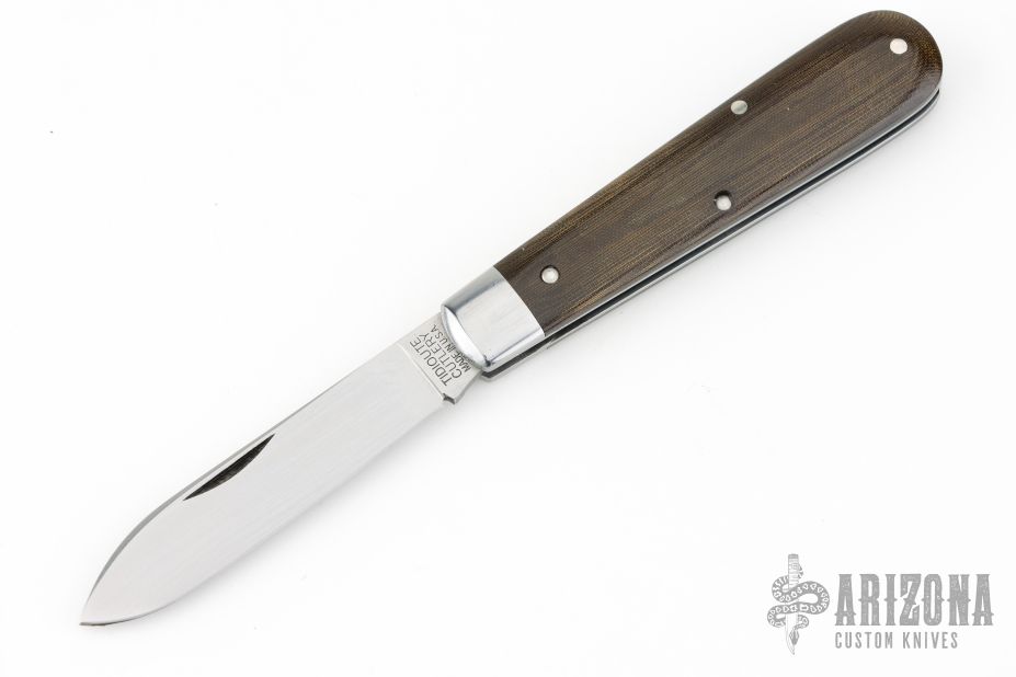 This slipjoint by Great Eastern Cutlery features a satin finished blade with a single nail nick. The handle has stainless bolsters, green linen micarta covers, stainless steel liners and spring. Has half stop. Comes with original tube. Excellent condition.