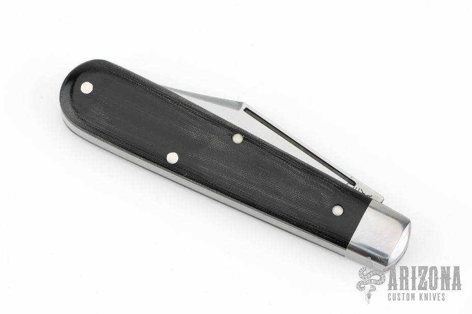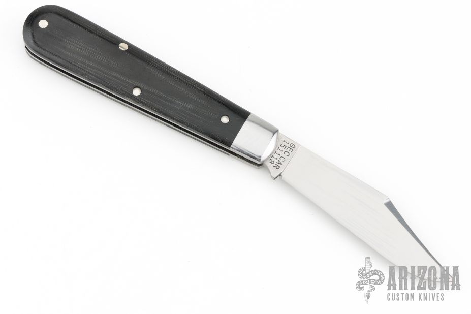 This slipjoint by Great Eastern Cutlery features a satin finished clip point blade with a single nail nick. The handle has stainless bolsters, Black linen micarta covers, stainless steel liners and spring. Has half stop. Comes with original tube. Excellent condition. 252 made