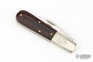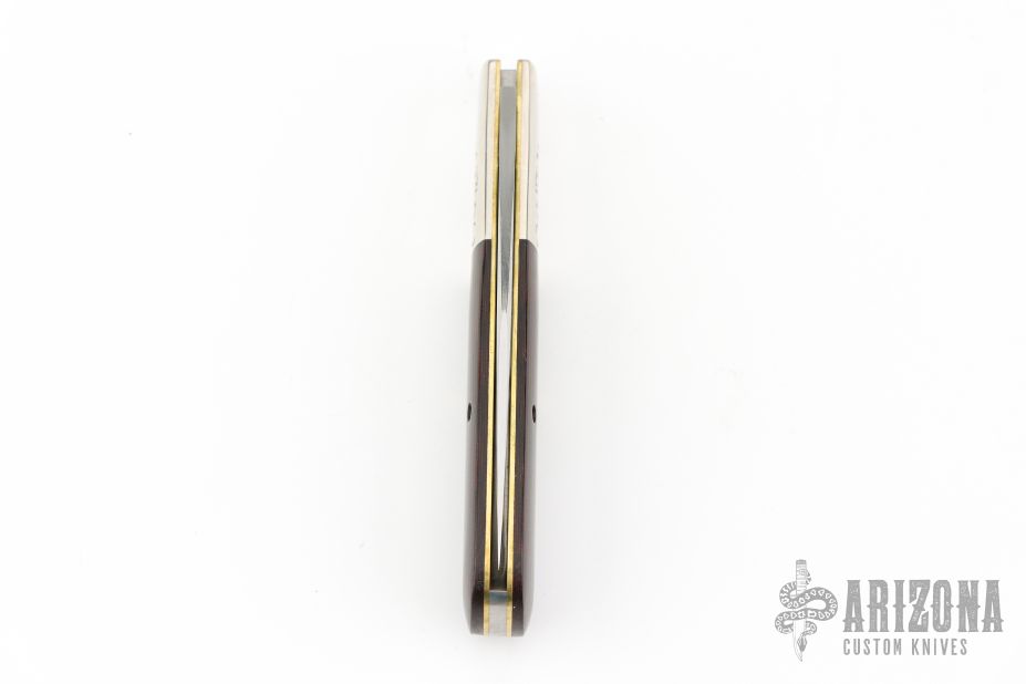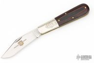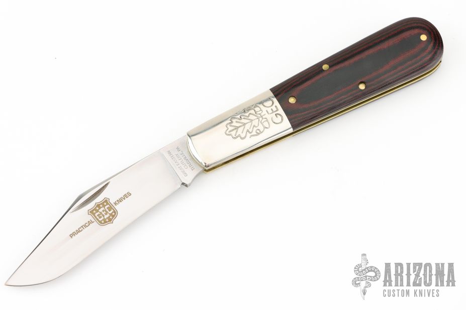 This Barlow from Great Eastern Cutlery features a satin finished clip point style blade with swedge. The handle has pinched and fluted nickel silver bolsters, red/black linen micarta covers over brass liners and stainless steel spring. Has Half-stop. Comes with original tube. Excellent condition.