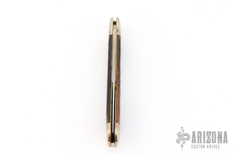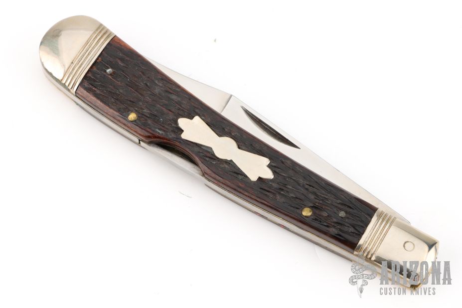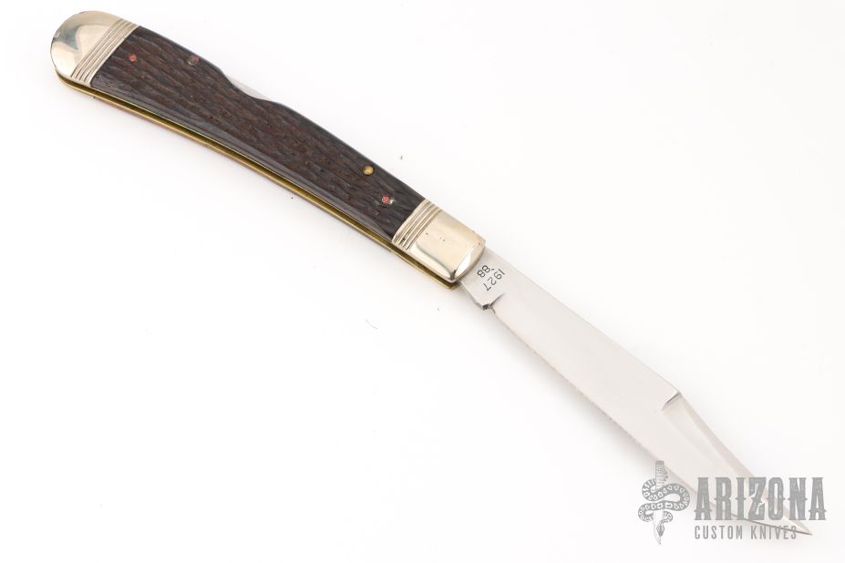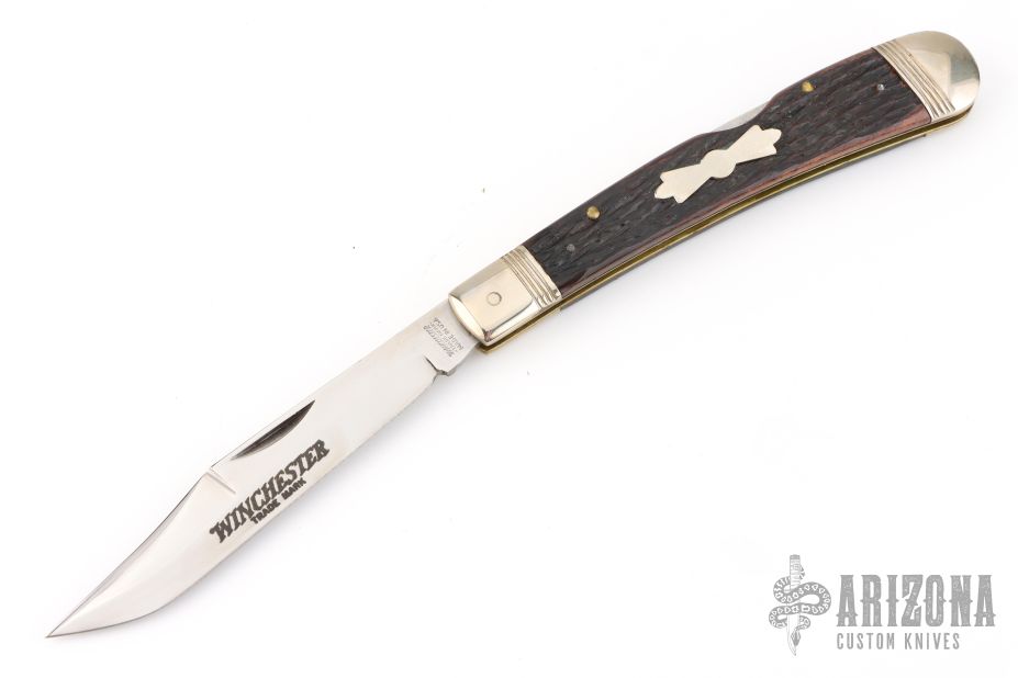 This Winchester folder features a mirror polished blade. Nickel Silver front and rear bolsters with jigged bone covers. Brass liners and steel spring. Original box. Has some light scratches and patina, otherwise Excellent Condition.