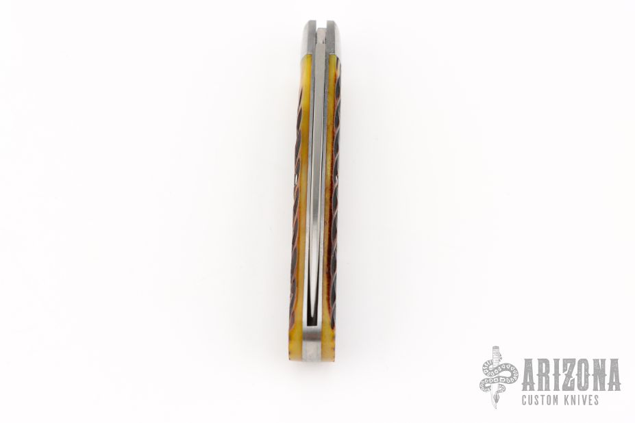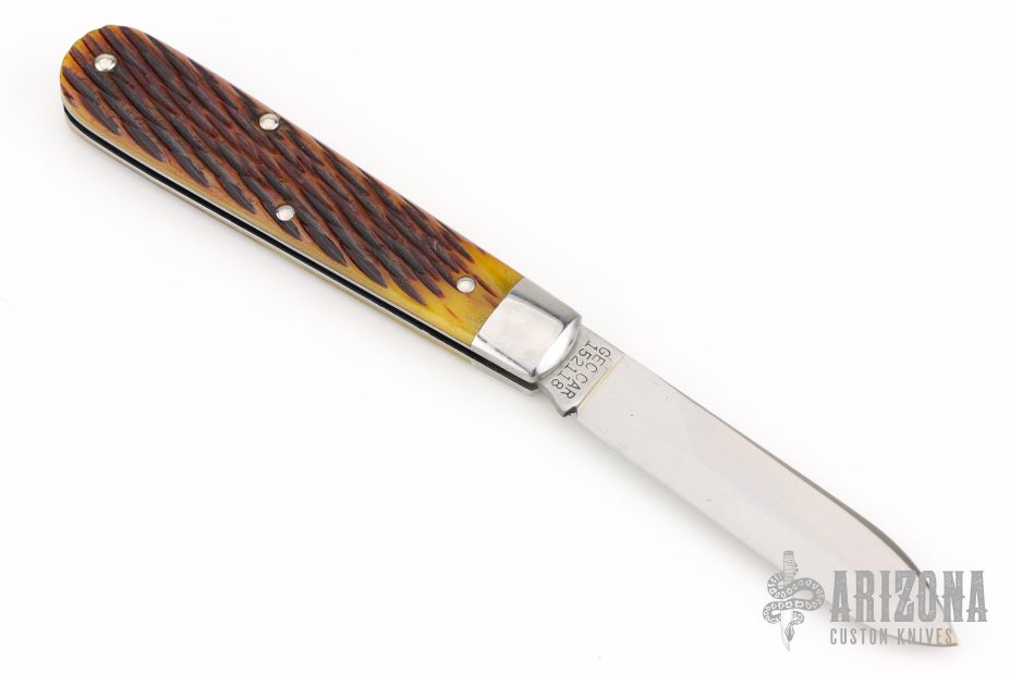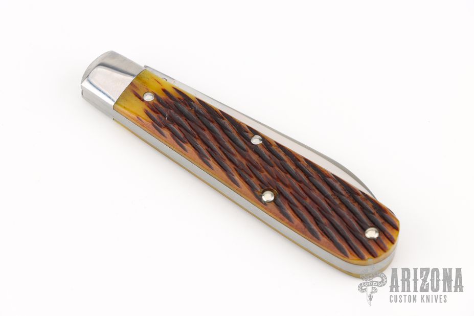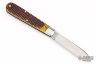 This slipjoint by Great Eastern Cutlery features a satin finished blade with a single nail nick. The handle has stainless bolsters, antique yellow jigged bone covers, stainless steel liners and spring. Has half stop. Comes with original tube. Excellent condition.