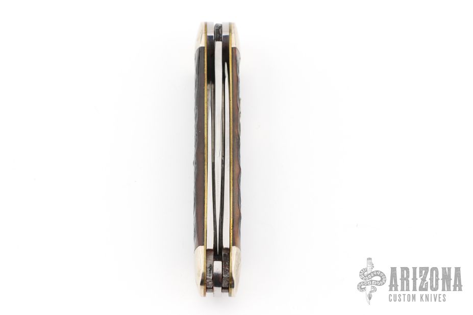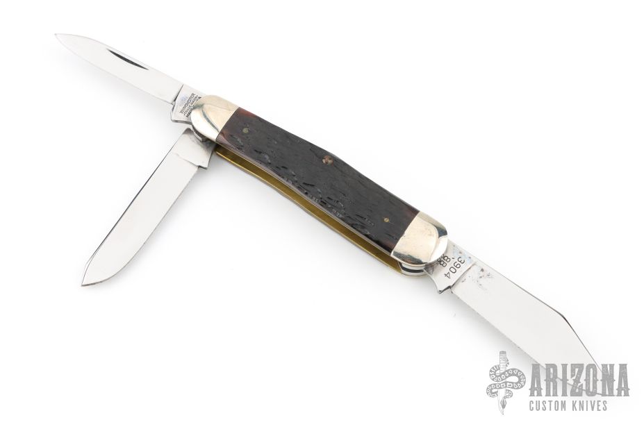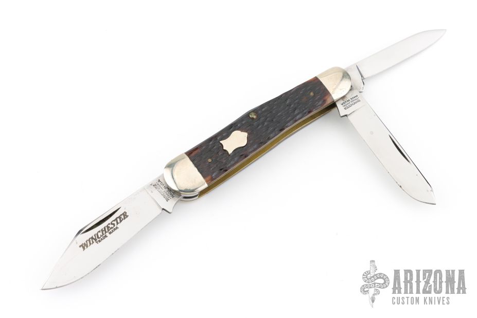 This Winchester folder features three mirror polished blades. Nickel Silver front and rear bolsters with jigged bone covers. Brass liners and steel springs. Original box. Excellent Condition.