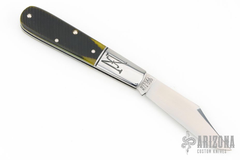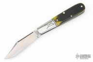 This Barlow from Great Eastern Cutlery features a clip point blade with swedge and long pull nail nick. The handle has fluted stainless steel bolsters, Spring Green Sawcut Bone covers over steel liners and spring. Includes original tube. Excellent condition.
