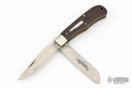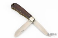 This "Hunter" Bullet Knife was the Remington Collector's Series Knife for 1989. It was intended to help sales of their model 4 and 6 rifles. Has two satin finished blades with nail nicks. The handle has pinched nickel silver bolsters, cocobolo covers, brass liners and steel springs. Comes with original box and papers. Excellent Condition.