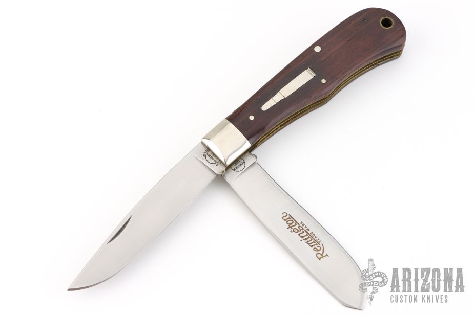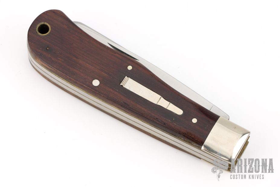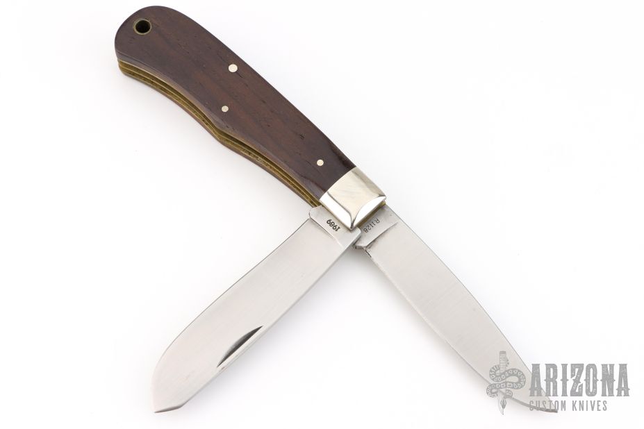 This "Hunter" Bullet Knife was the Remington Collector's Series Knife for 1989. It was intended to help sales of their model 4 and 6 rifles. Has two satin finished blades with nail nicks. The handle has pinched nickel silver bolsters, cocobolo covers, brass liners and steel springs. Comes with original box and papers. Excellent Condition.