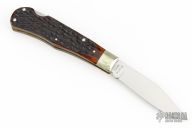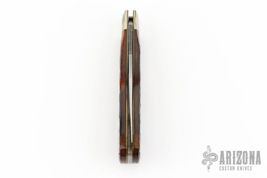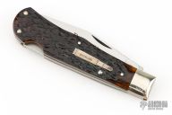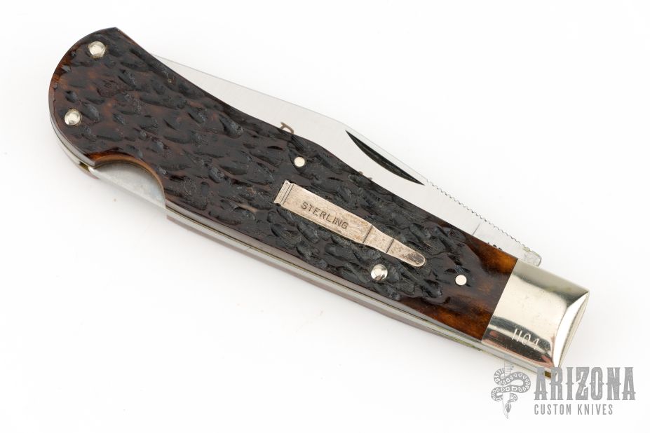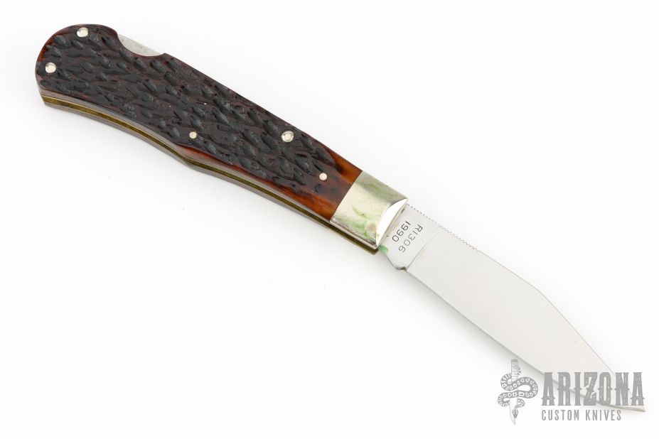 This "Tracker" bullet knife was the Remington Collector's Series Knife for 1990.  This knife features a satin finished blade with a notched thumbrest and a single nail nick.  The handle has nickel silver bolsters, bone scales, brass liners and a stainless steel backspring.  Includes the original box and papers. #1104. Has some patina, blade was stored greased. Great condition for its age.