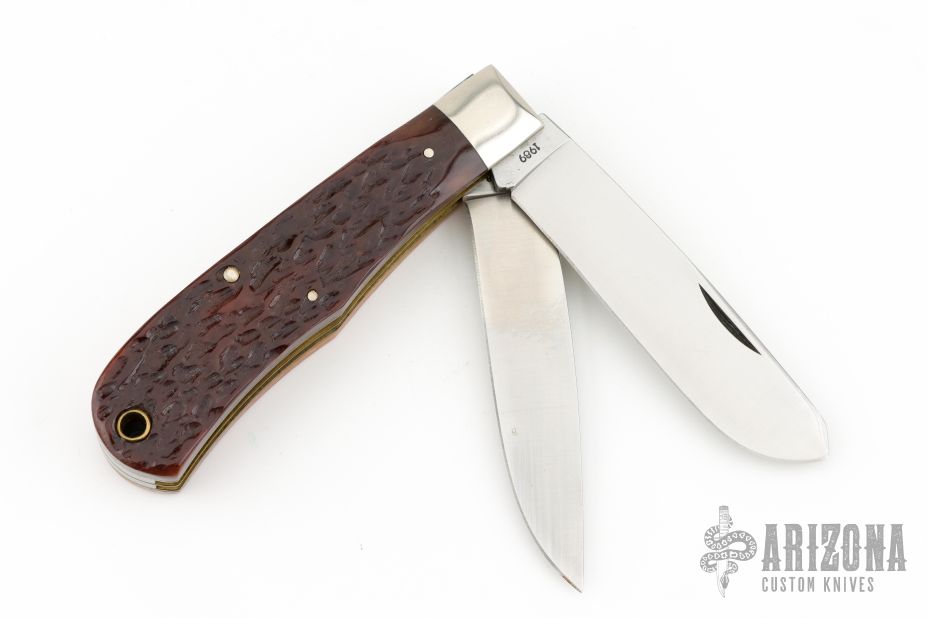This Limited Edition Trapper Silver Bullet Knife has two satin finished blades with nail nicks. The handle has pinched nickel silver bolsters, jigged bone covers, brass liners and steel springs. Comes with original box and papers. Has some light patina, and some scuffs otherwise Excellent Condition. 1989 S/N 4255