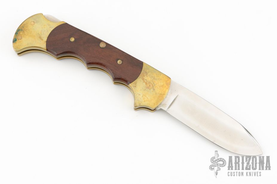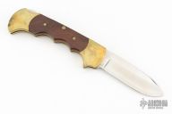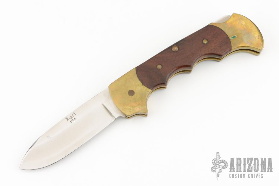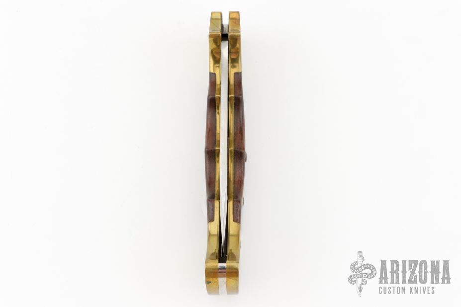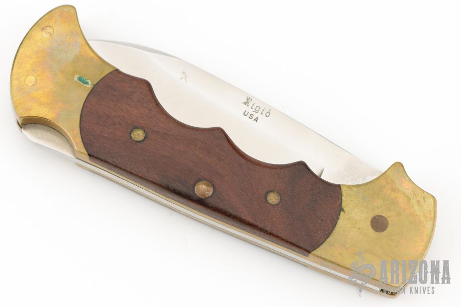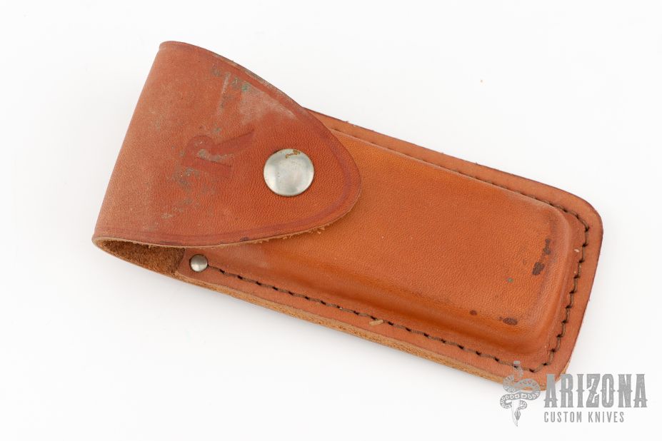 This lockback by Rigid Knives features a satin finished blade. The handle has a brass frame with rosewood inlays and a stainless steel backspacer. Nice lockup. Has some scuffs scratches, and patina good condition otherwise. Comes with original original box and leather sheath.