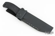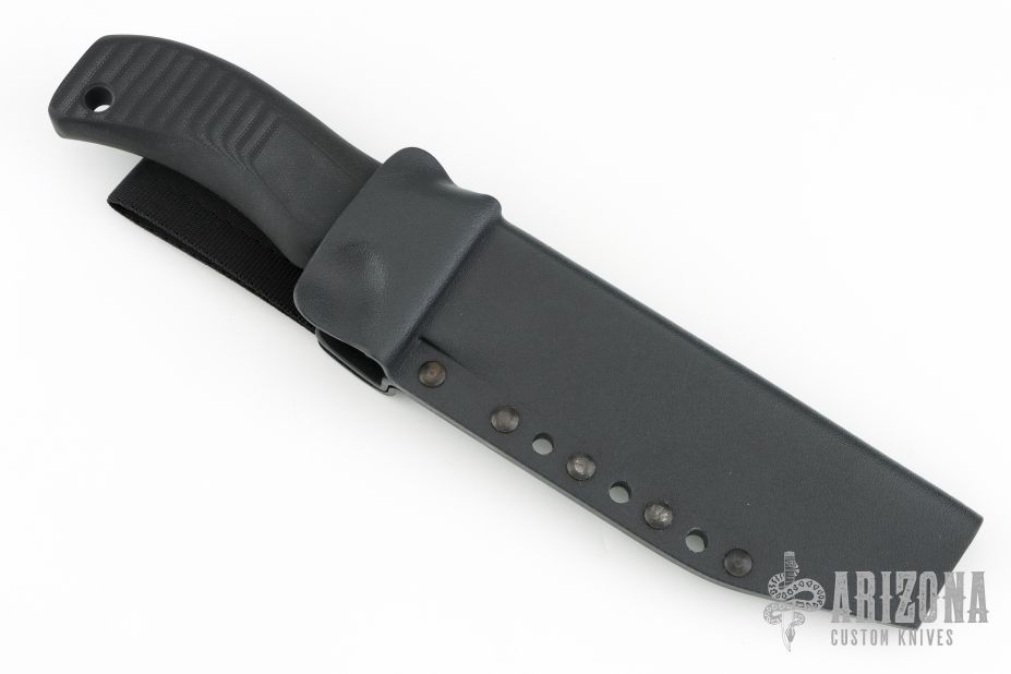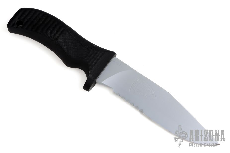This SERE Instructor by MadDog Knives features a partially serrated blade. .255" stock. 1.479" blade depth. Selectively tempered, the knife has a Rockwell C-scale hardness of 62 at the edge (as hard as a file), and HRC 50-54 throughout the spine and hidden full tang. Hard chrome blade finish.  The handle is designed to be ergonomic and has the ability to withstand tremendous punishment with little or no damage. It is hard and tough enough to be used as an impact tool. Includes a kydex sheath. Excellent condition.