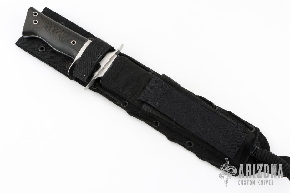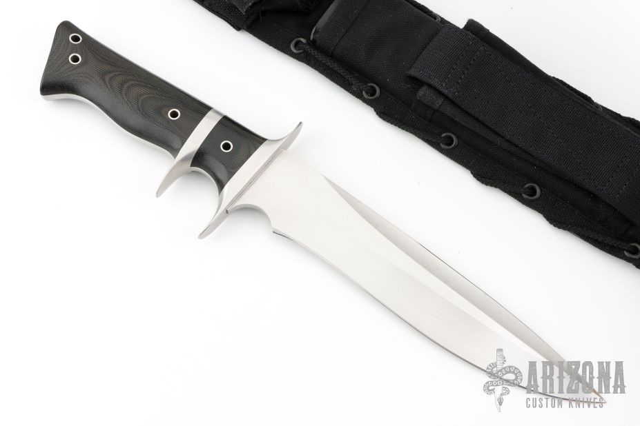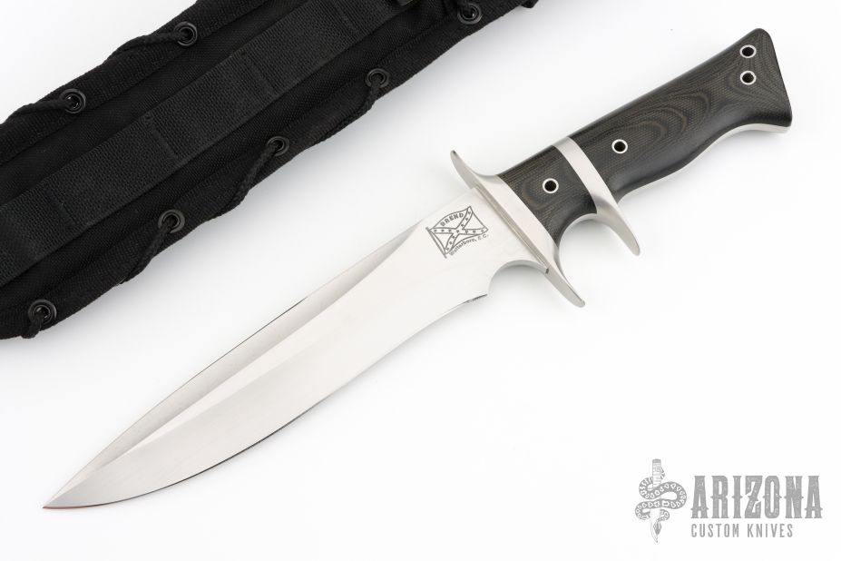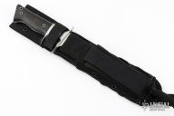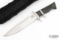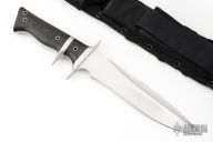 This Model 2 Sub-Hilt by Walter Brend features a double hollow ground blade with hand-rubbed satin finish, and a 4.5" sharpened top edge, .239" blade stock and 1.614" blade depth, full tang construction. The handle has a satin finished titanium double guard and sub-hilt, and black canvas micarta scales, hollow tube pins and lanyard hole. This knife is beautiful and sports the "Walterboro, SC" logo. Comes with a zippered case and a black Spec-Ops sheath. Excellent condition.