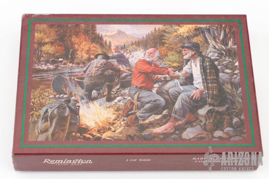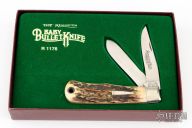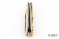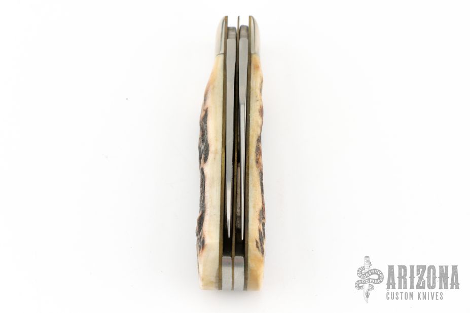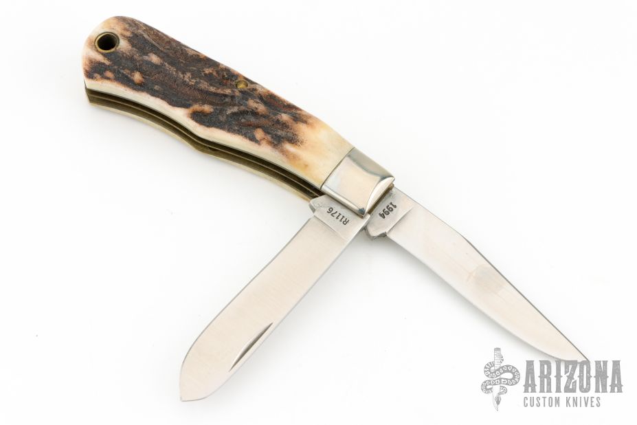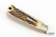 This slipjoint by Remington Knives features a satin finished blades with nail nicks. The handle has nickel silver bolsters, stag covers with a nickel silver bullet escutcheon, brass liners and stainless steel spring. Has half-stop, flush in all positions. Comes with original box and papers. Excellent condition otherwise. #0964