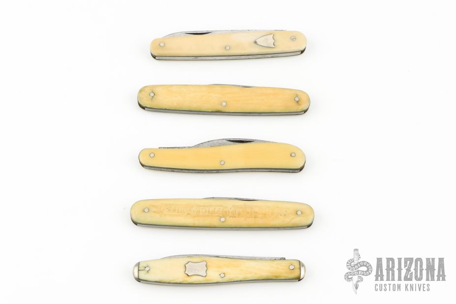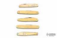 Lot of Five vintage slipjoints that have two blades with nail nicks. The handle has vintage yellow covers over brass liners and steel spring. They all have scuffs, scratches, light rust, and patina. Good condition for their age.
