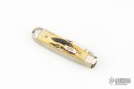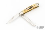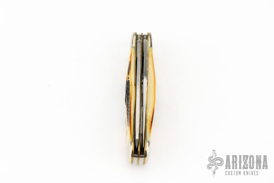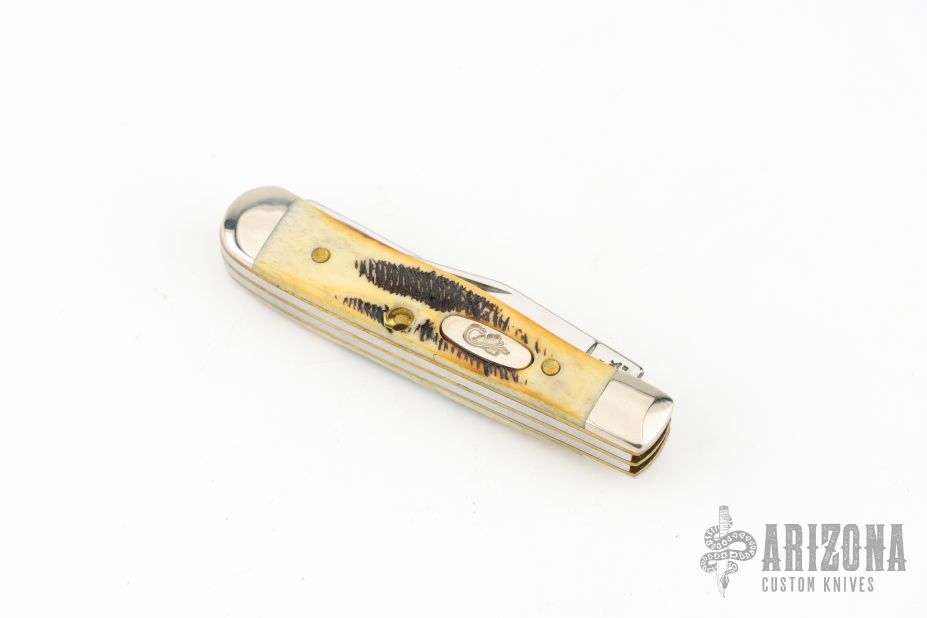 This Tiny Trapper by Case knives features polished blades with nail nicks. The handle has nickel silver bolsters, shield, stag covers, brass liners and stainless springs. Comes with original box and papers. Excellent condition.