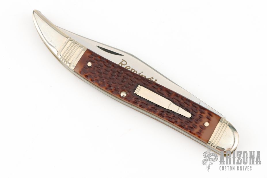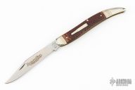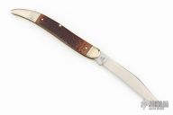 This Texas Toothpick has a satin finished blade with a nail nick. The handle has nickel silver bolsters, jigged bone covers and brass liners.  Stainless Steel backspring.  Includes the original box. Has some light scuffs and patina, otherwise Excellent Condition.