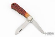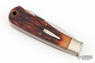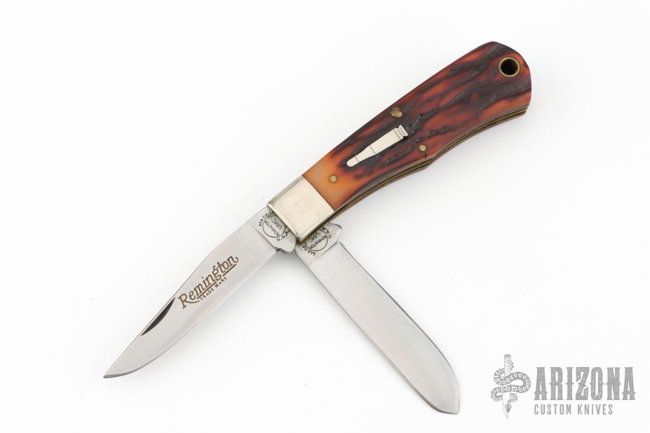 This Bullet Knife by Remmington has two satin finished blades with nail nicks. The handle has nickel silver bolsters, stag covers, brass liners and steel springs.  Includes the original box and papers. Has some scuffs otherwise Excellent Condition.