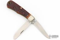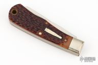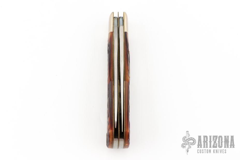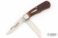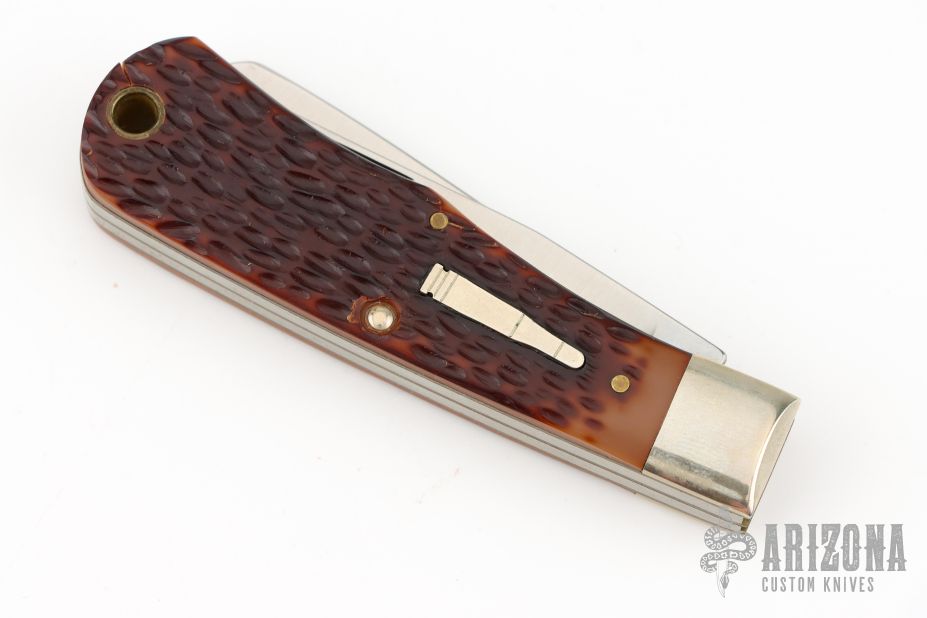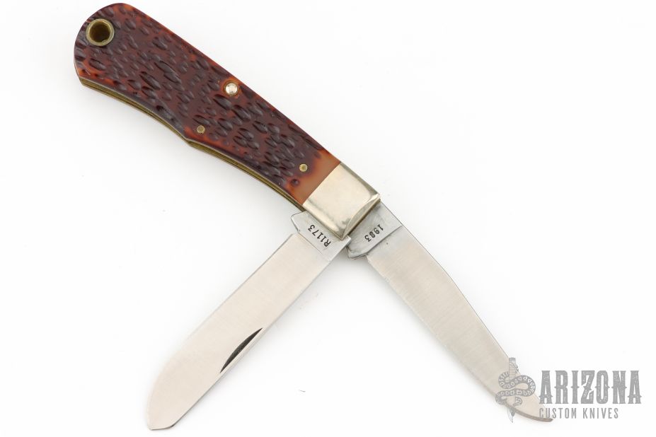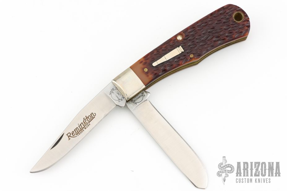 This Bullet Knife by Remmington has two satin finished blades with nail nicks. The handle has nickel silver bolsters, jigged bone covers, brass liners and steel springs. Has some patina. Excellent Condition. Comes with original box.