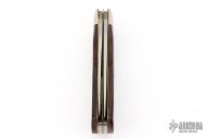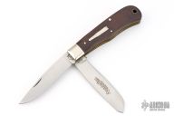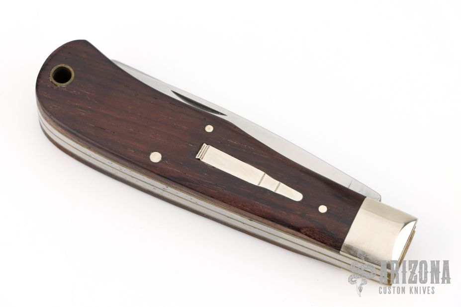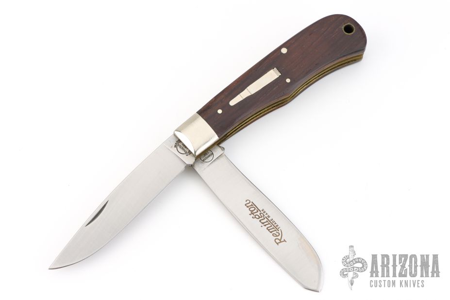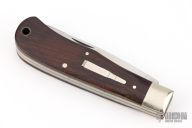 This "Hunter" Bullet Knife was the Remington Collector's Series Knife for 1989. It was intended to help sales of their model 4 and 6 rifles. Has two satin finished blades with nail nicks. The handle has pinched nickel silver bolsters, cocobolo covers, brass liners and steel springs. Comes with original box. Has some patina. Excellent Condition.