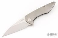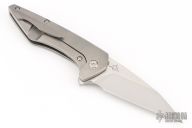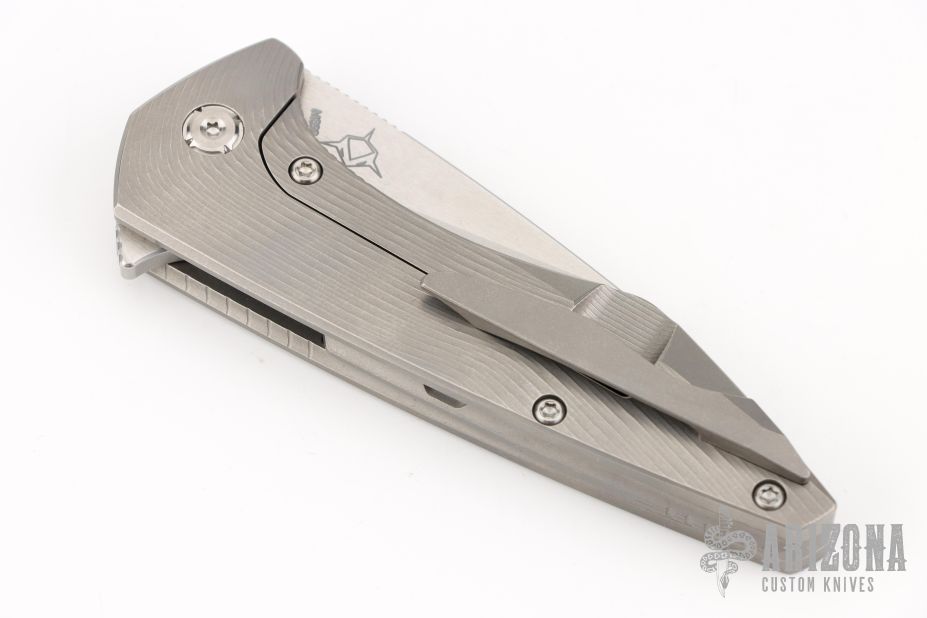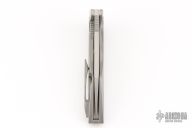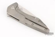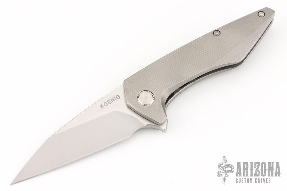 The Koenig Mini-Goblin 3 inch folding pocket knife is a collaboration between Edison Barajas of Sharknivco and Koenig Knives. The Mini-Goblin features a 3 inch burnished w/ PF blade with notched thumbrest and flipper. The handle has a burnished sea pattern titanium frame with a titanium backspacer and pivot/hardware. Titanium tip up clip with hidden screws. Comes with original box and card dated April 3, 2025. New condition.