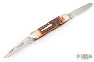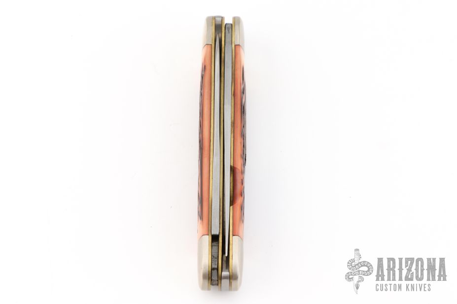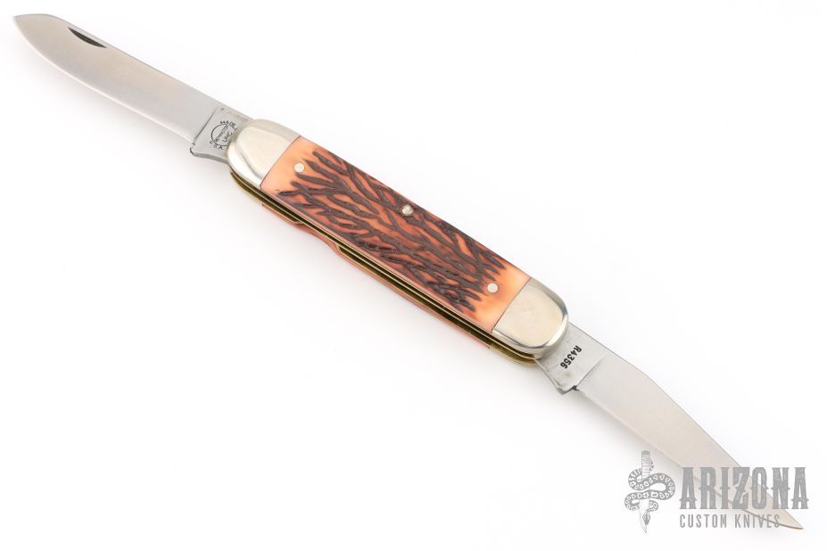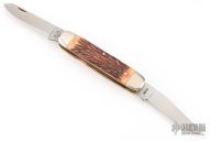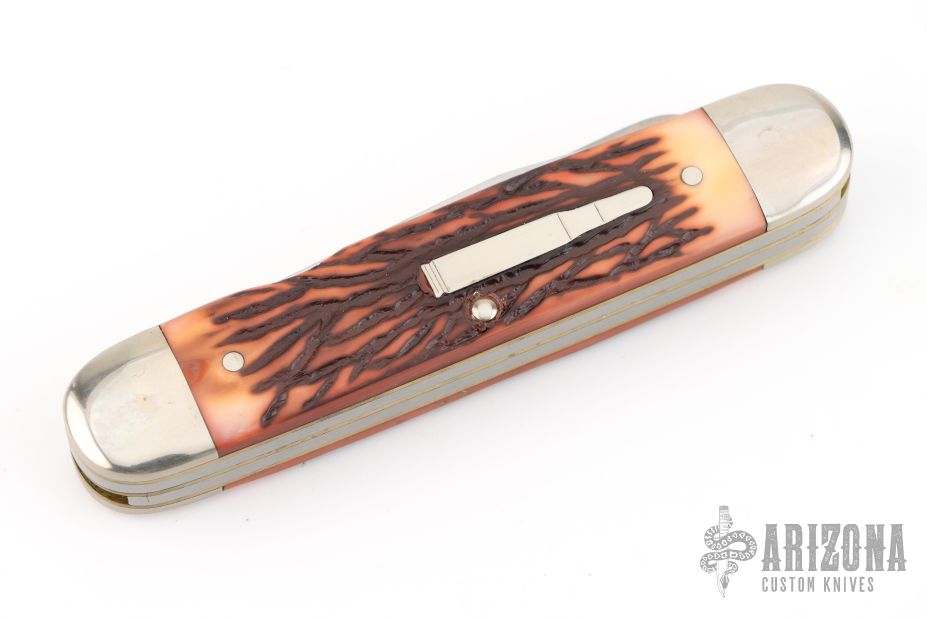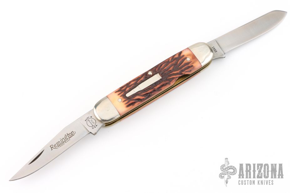 This Limited Edition Bush Pilot Silver Bullet Knife by Remmington has two satin finished blades with nail nicks. The handle has nickel silver bolsters, faux stag covers, brass liners and steel springs.  Comes with original box. Excellent condition.