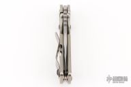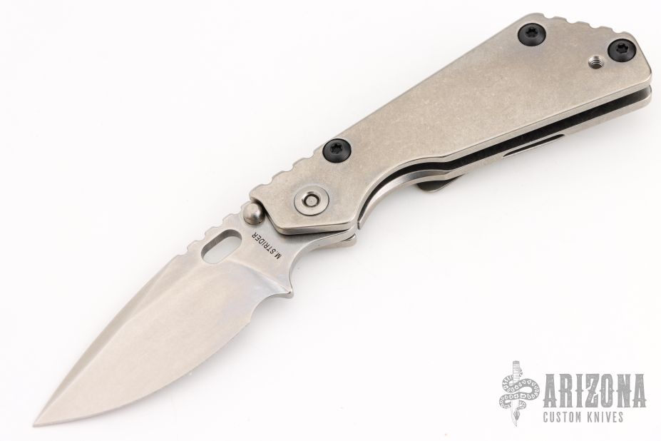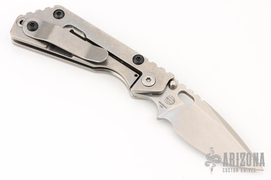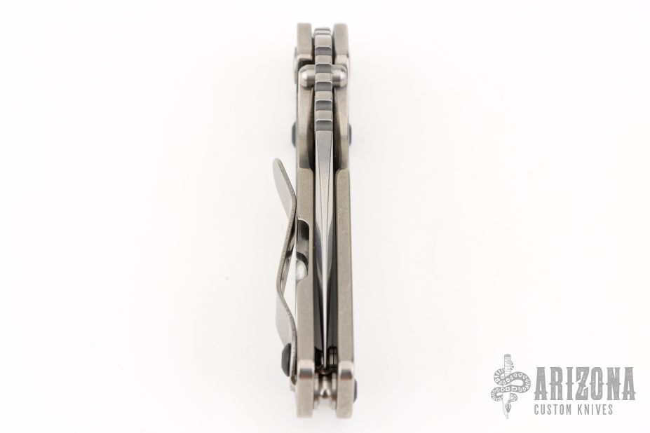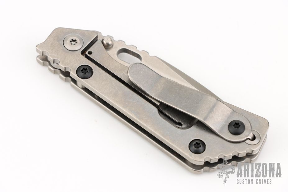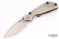 This PT by Mick Strider features a stonewashed blade with notched thumbrest and thumbhole. The handle has a stonewash titanium frame with matching tip up clip. New condition.
