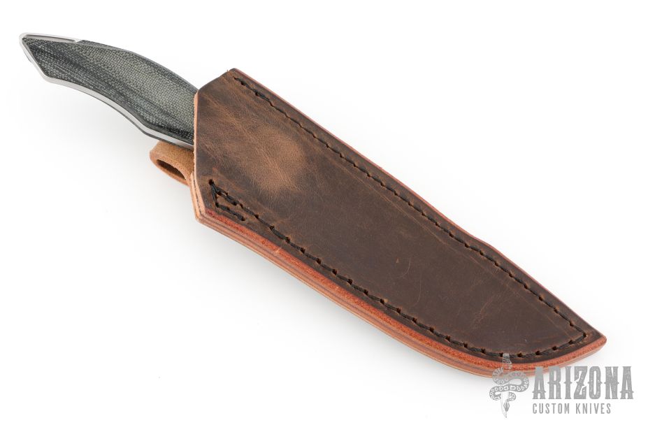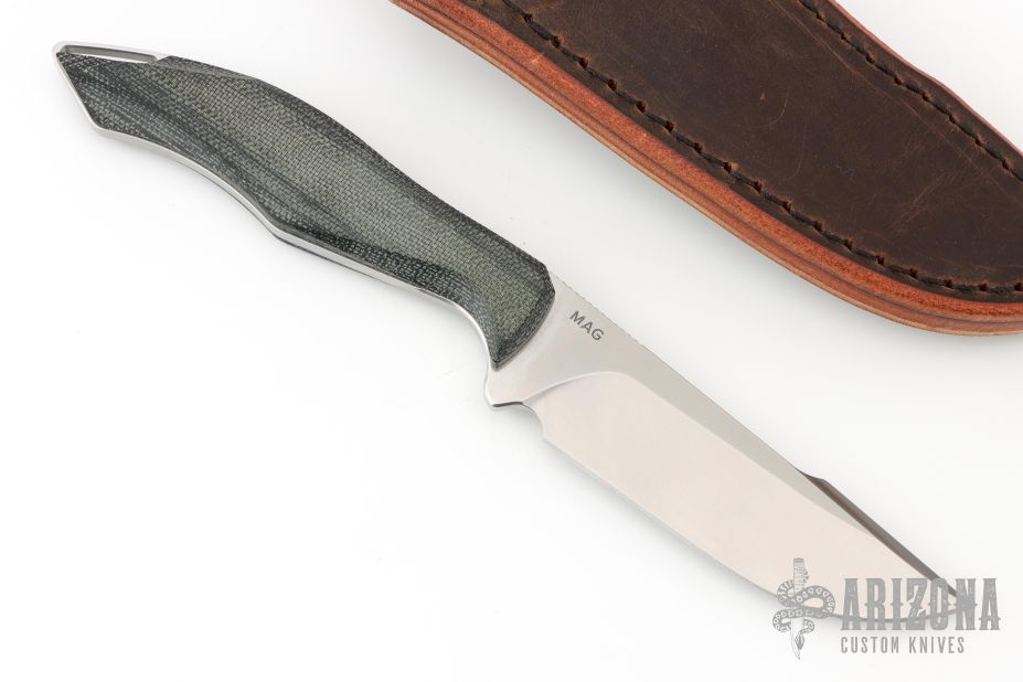 This Helo by Koenig features a brightwashed Magnacut blade with notched thumbrest and false top edge, .141" blade stock and 1.046" blade depth, full tang construction. The handle has black canvas micarta scales with hidden pins. Comes with original box, brown leather sheath and COA dated April 3, 2025. New condition.