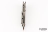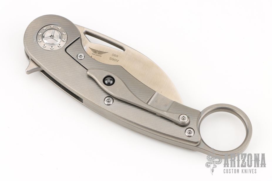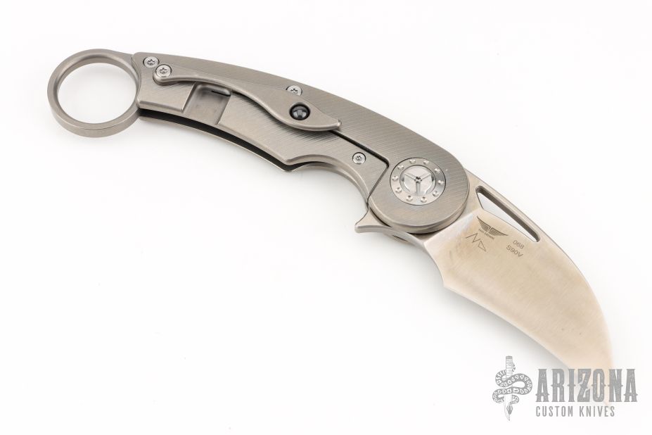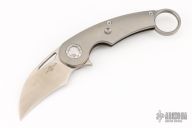 This karambit features a satin finished hawkbill blade with a thumbhole, flipper tab, and a notched thumbrest.  The handle features a titanium frame with tip up clip with ceramic ball insert. Has a couple light scuffs, excellent condition otherwise.