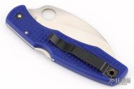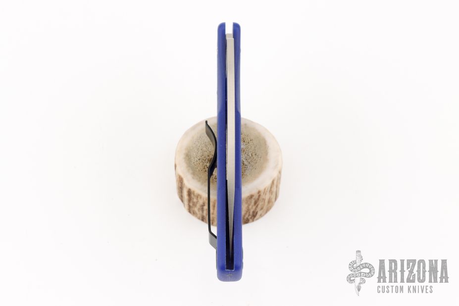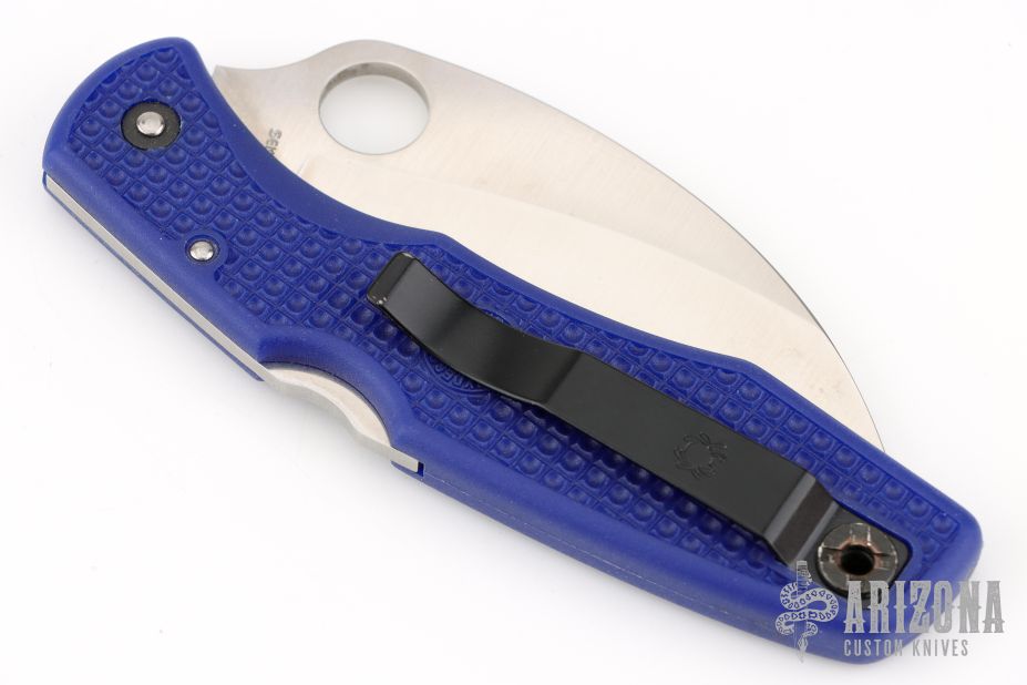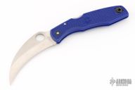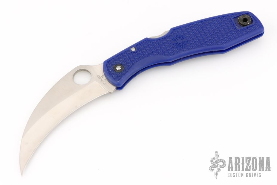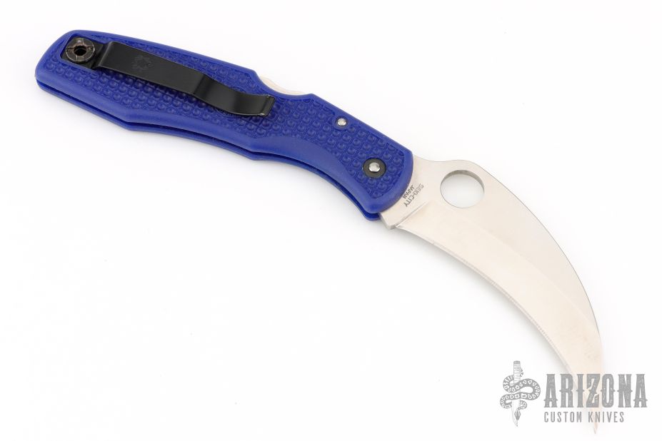 This SpyderHawk by Spyderco features a satin finished hawkbill blade with thumbhole, blue FRN frame and stonewashed stainless steel tip up clip. Has some light scuffs, excellent condition otherwise.