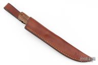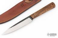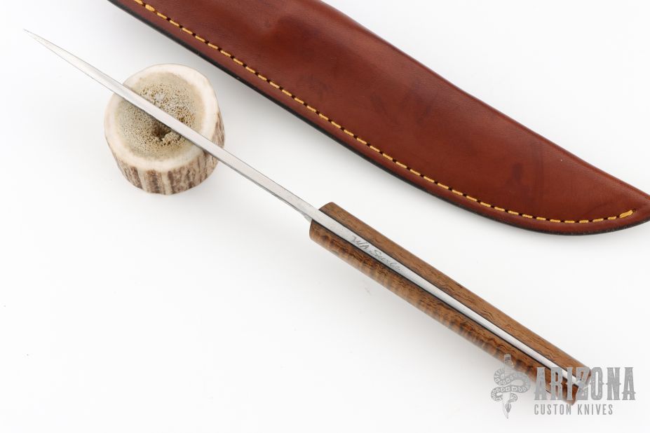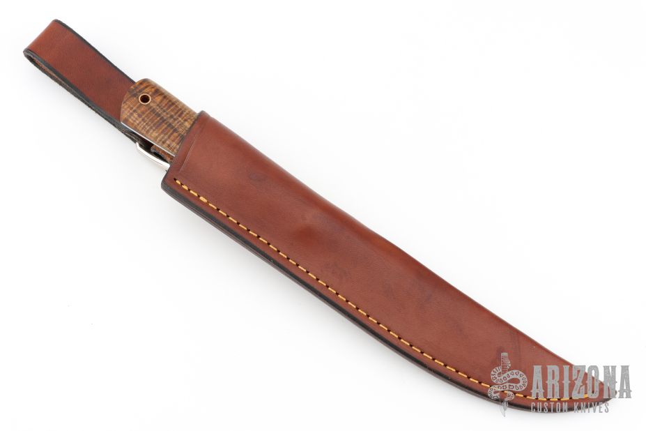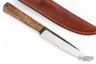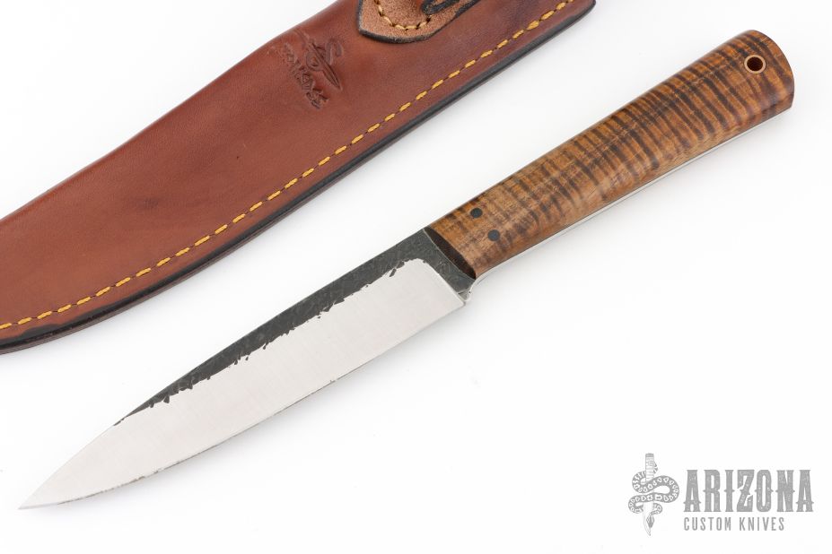 This knife by WA Surls features a flat ground drop point blade with hammered flats, .167" thick blade with 1.041" blade depth, full tapered tang construction. The handle has exhibition grade curly koa wood scales with black liners and copper lanyard hole. Includes a brown leather sheath. Excellent Condition.
