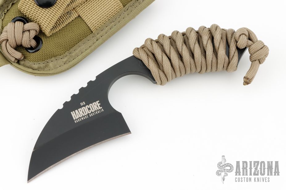 This one has a D2 blade, cord wrapped handle with nylon/kydex sheath. Has some light scuffs, excellent condition otherwise.