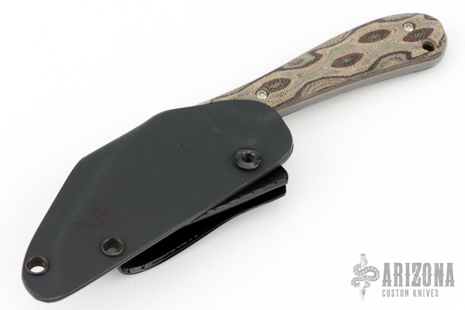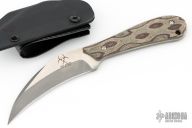 This knife by Steve Ryan features a two-tone acid/tumble finish blade with notched thumb ramp, .143" blade stock and 1.090" blade depth, full tang construction. The handle has micarta scales and lanyard hole. Comes with a kydex sheath. Has a couple of marks on the tip of the blade, otherwise Excellent condition.